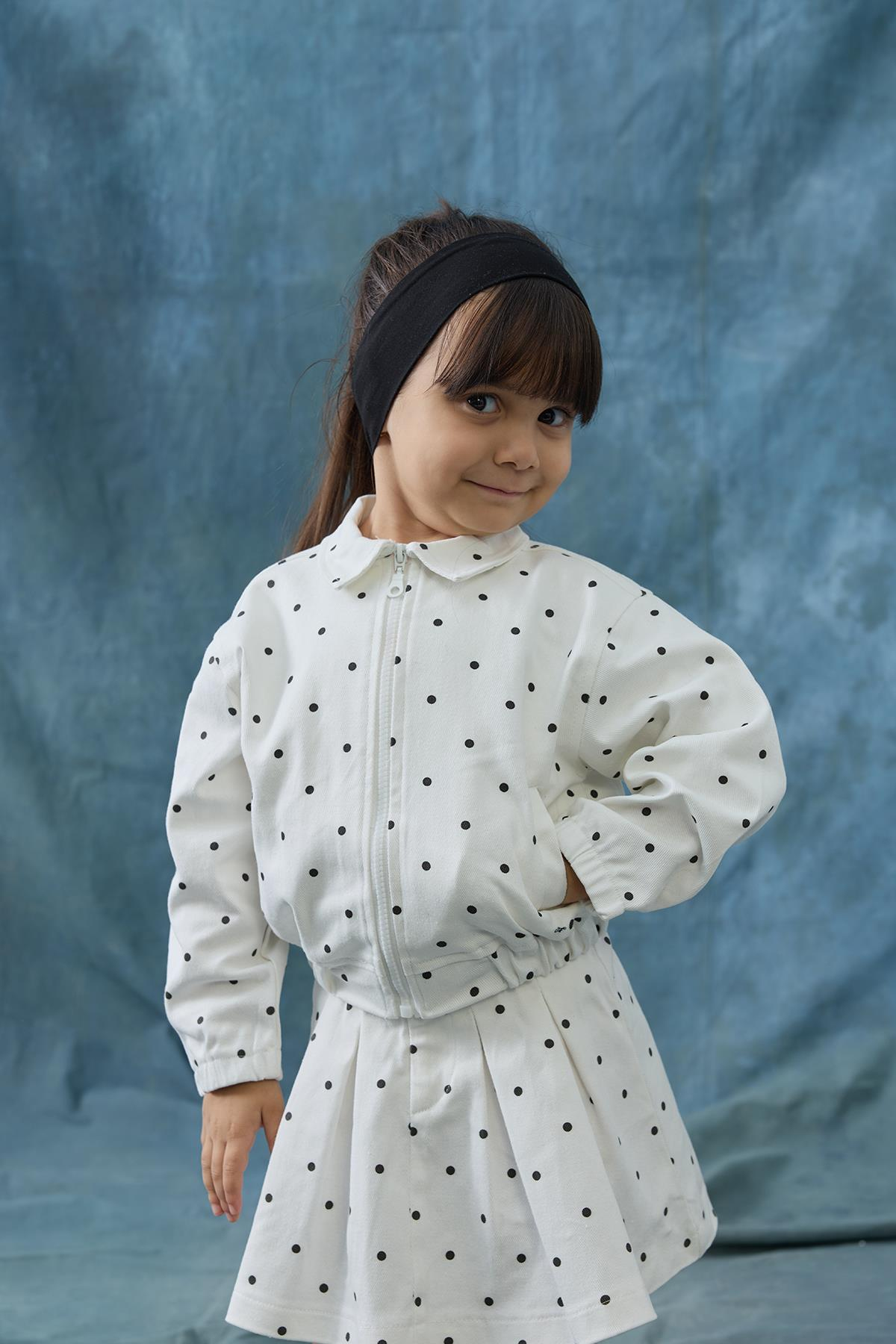 Miniklerin enerjisini yansıtan siyah beyaz puantiyeli bomber ceket, modern stili ve konforu bir araya getiriyor.